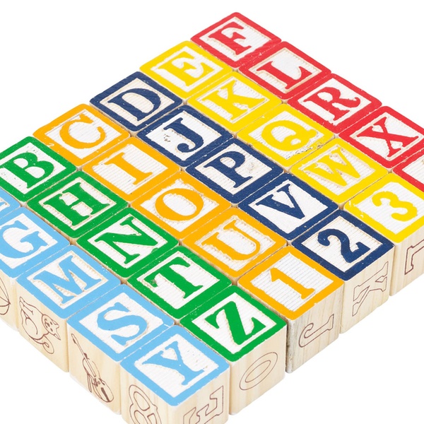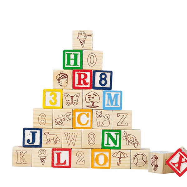 30 Holzklötze mit Buchstaben, Zahlen und Motiven
