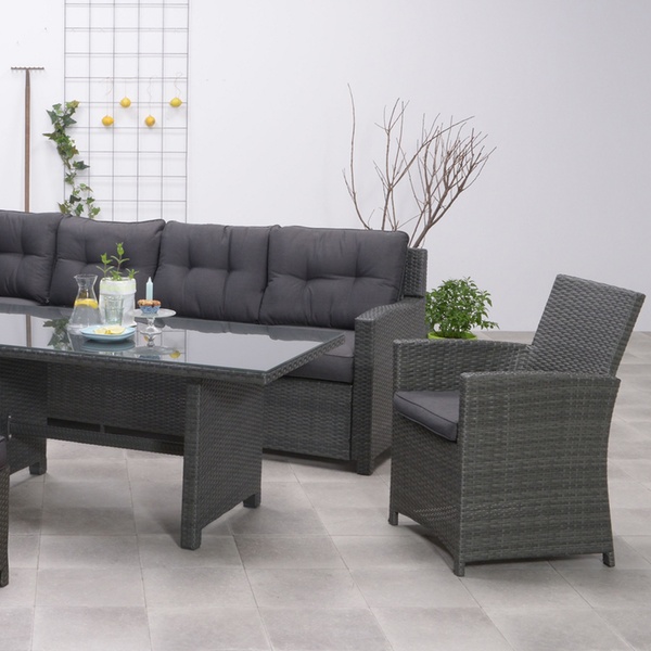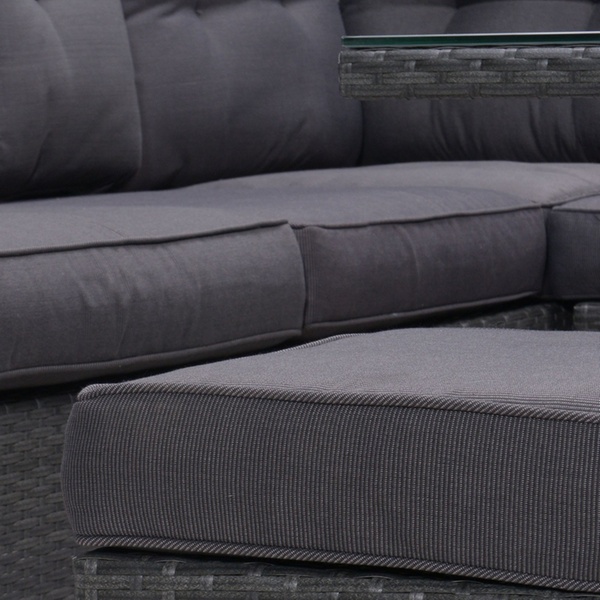 Elegante Garten-Lounge „Aboyne“ mit Ecksofa, Tisch, 2 Sesseln und Hocker mit UV-beständigem Geflecht und 10 cm starken Kissen