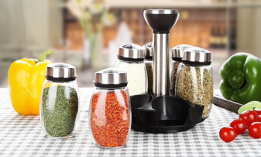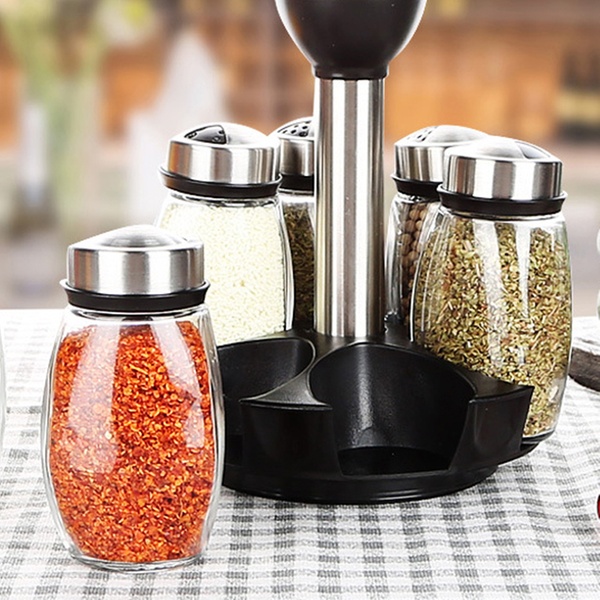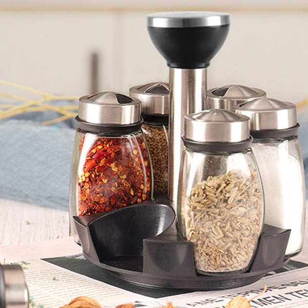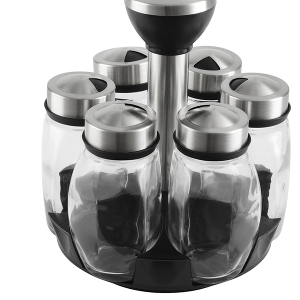 Dieses Gewürzglas-Set mit einem 360° drehbaren Ständer bietet einen einfachen Zugang zu verschiedensten Gewürzen beim Kochen