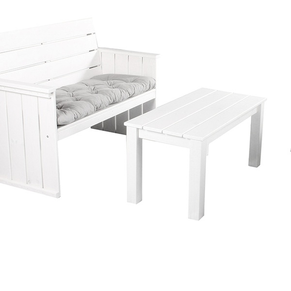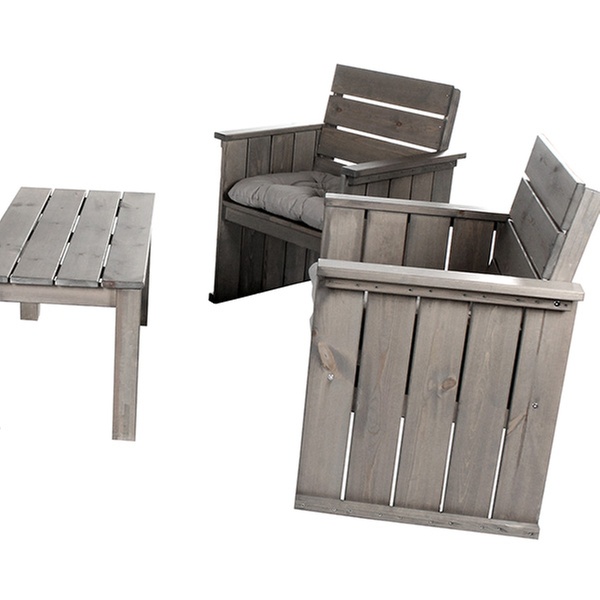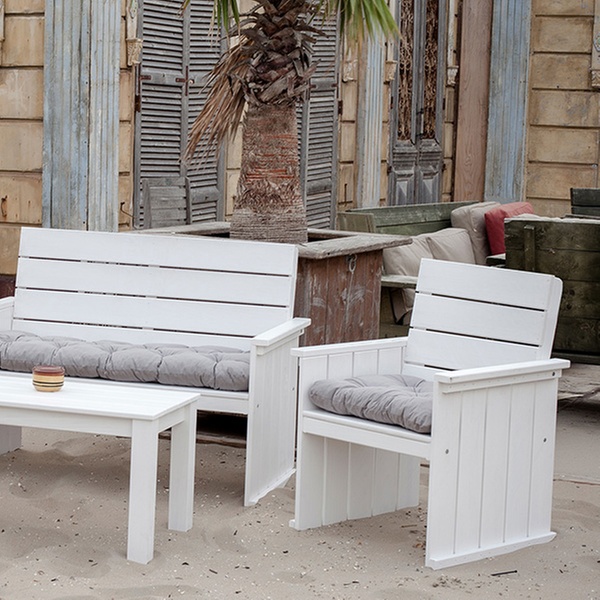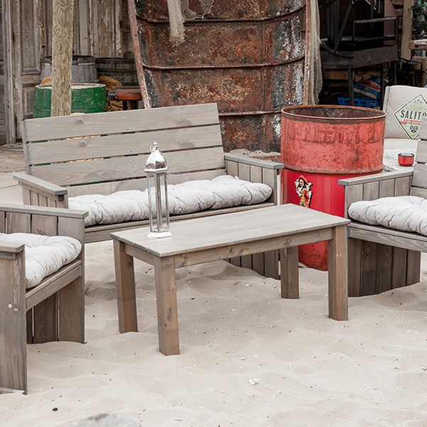 Sessel, Zweisitzer-Bank und Tisch im Strand-Look aus europäischem FSC-zertifiziertem Holz als preisgünstige Alternative zu teurerem Teakholz