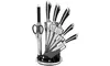 Ein Messer-Set mit Ständer von Royalty Line aus Edelstahl mit u.a. Hackmesser, Chef-Messer, Brotmesser, Universalmesser, Schälmesser
