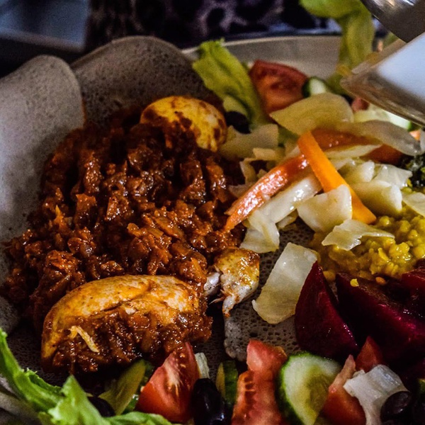 - Dorowat: äthiopisches Nationalgericht – Hühnerfleisch mit würziger Soße, Ei, hausgemachtem Frischkäse