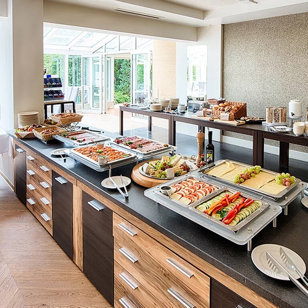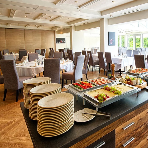 Ein reichhaltiges Frühstücksbuffet mit frischem Obst, knusprigen Brötchen, herzhaften Wurst- und Käsesorten sowie einer abwechslungsreichen „warmen Ecke“ mit Rührei und Bacon sorgt für einen genussvollen Start in den Tag. Dazu rundet ein Glas Sekt das Erlebnis elegant ab und verleiht dem Frühstück eine besondere Note.