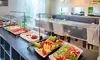 Reichhaltiges Frühstücksbuffet mit vielfältigen Leckereien, frischem Obst, warmen Köstlichkeiten und einem Glas Sekt sorgt für einen perfekten Morgen