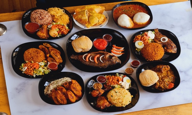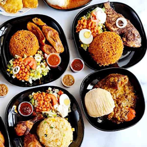 • Jollof Reis mit verschiedenen auswählbaren Toppings bis zu einem Gesamtwert von 15 Euro (Rind, Huhn, frittiertes Ei, Jollof, Waakye, Kenkey, Banku, Fisch(1/2), Beans)
