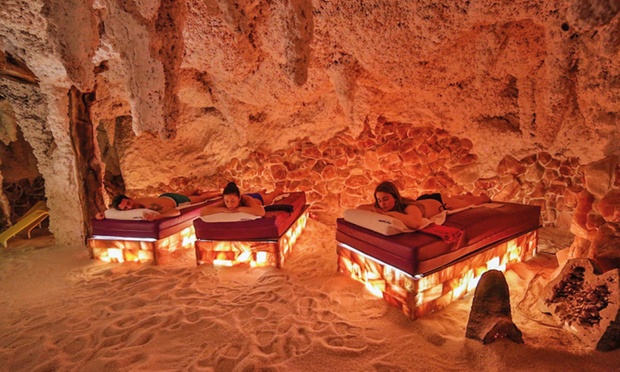 - Erlebnisgrotte mit heißem Stein und Dampfbad, Textilsauna, Solebrunnen, Erlebnisduschen und beheizten Sitzbänken