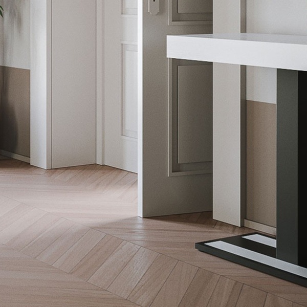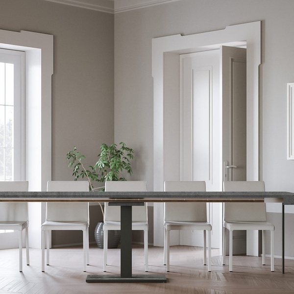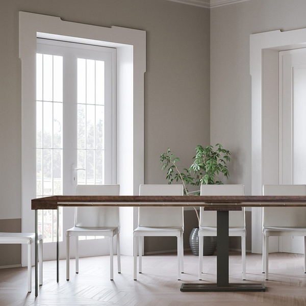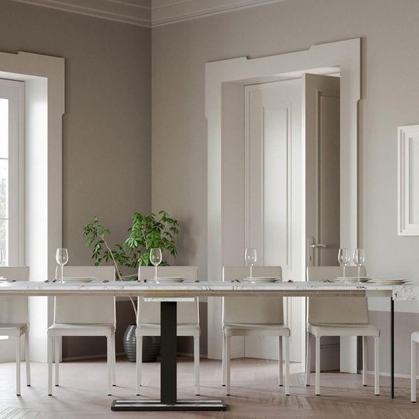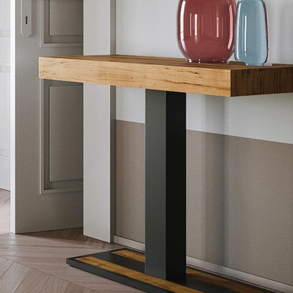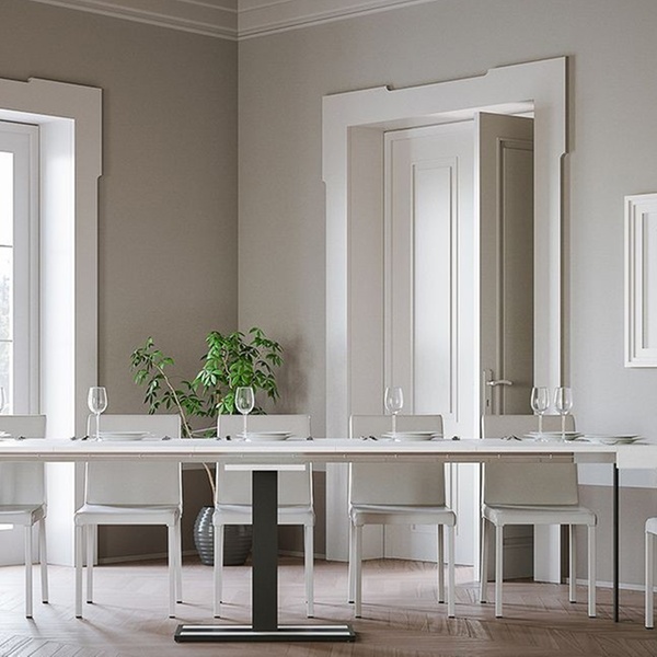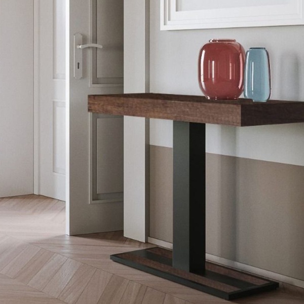 Dieser kompakte Konsolentisch kann ohne großen Aufwand in einen Esstisch für bis zu 14 Personen verwandelt werden