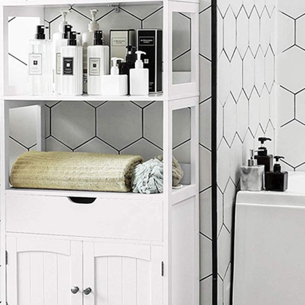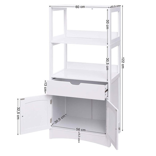 - Badezimmermöbel: Badregal mit 2 Türen, Schublade und Ablagen