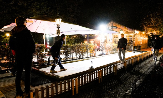 Spaß mit Freunden beim Eisstockschießen im Winterbiergarten der neobarocken Villa im Luitpoldpark genießen
