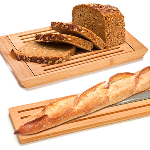 Schneidebrett aus Bambus-Holz in 2 Varianten: mit einem Auffang-Behälter oder mit einem Messer und praktischem Griff