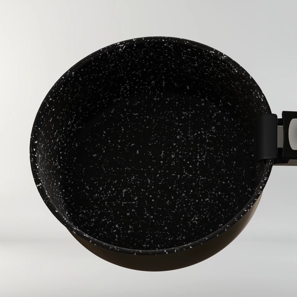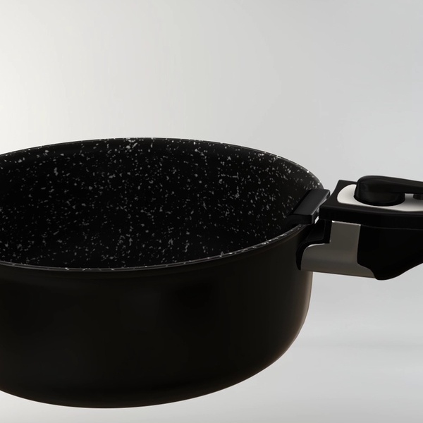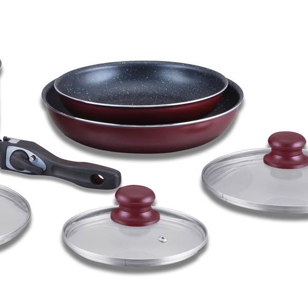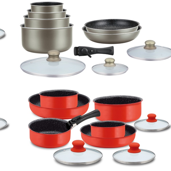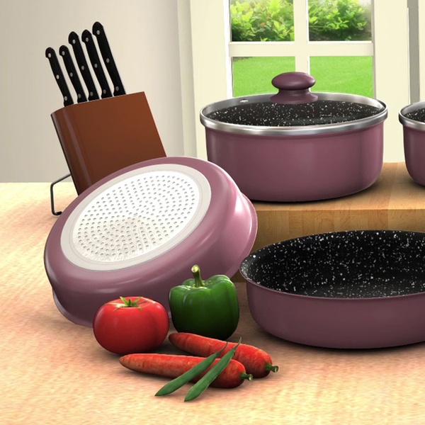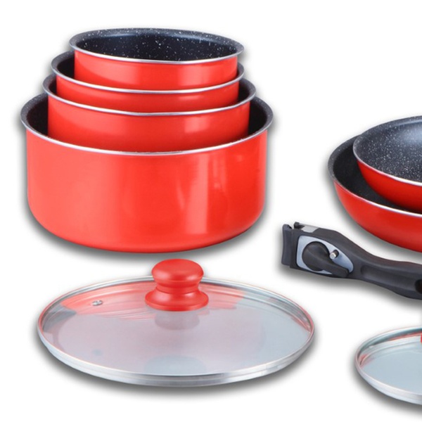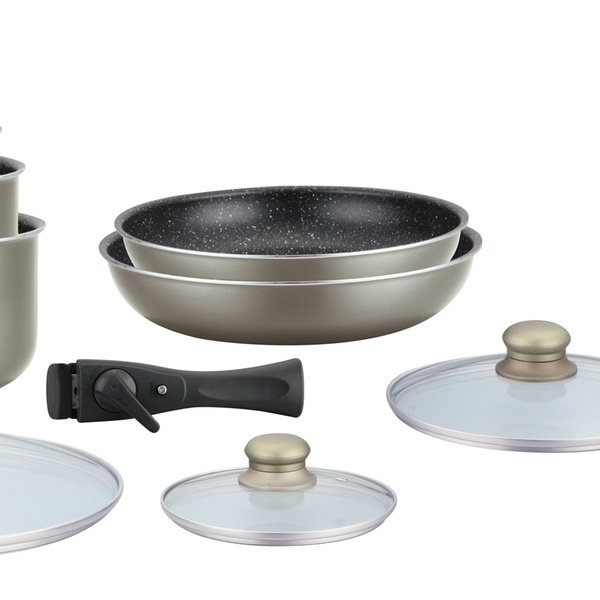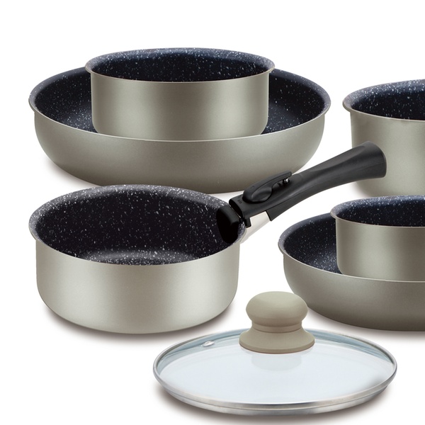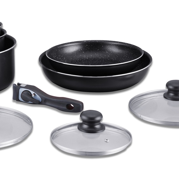 Ein komplettes Set mit Töpfen und Pfannen aus hochwertigem Edelstahl mit Marmorbeschichtung, die das Essen schnell und gleichmäßig erhitzten