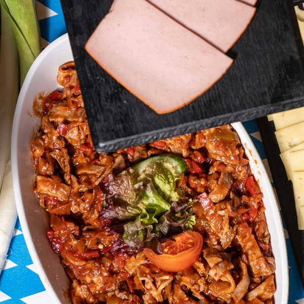 - Verschiedene Salate und Vorspeisen oder Beilagen, wie z.B. Knödel, Sauerkraut, Kartoffelgratin, Marktgemüse, Braten-Sauce