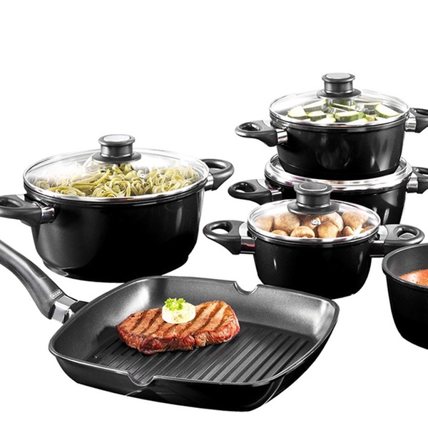Aluminiumguss-Töpfe mit Antihaftversiegelung, Glasdeckel mit Dampfauslassventil, Präzisions-Thermoboden, Grillpfanne und Küchenhelfer-Set