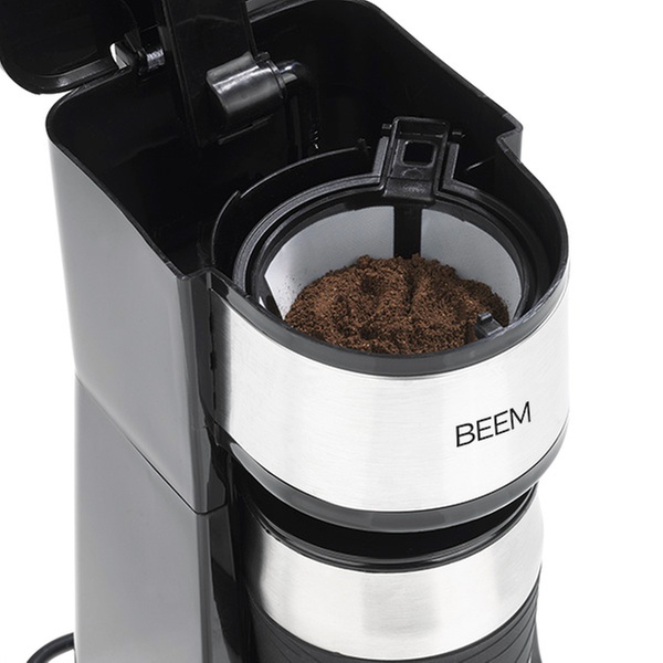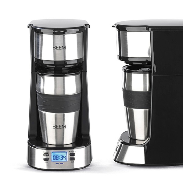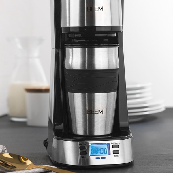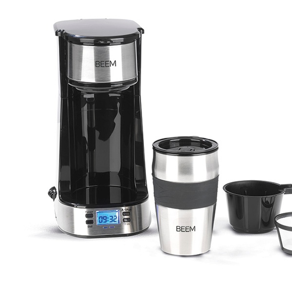 Kompakte Kaffeemaschine mit 24-Stunden-Timer, digitalem LC-Display und doppelwandigem 0,4-Liter-Thermobecher mit Deckel und Trinköffnung