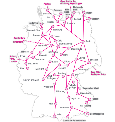 - Komfortable, preiswerte und zuverlässige Verbindungen, z.B: Berlin-München, Berlin-Hamburg, Berlin-Hannover, Berlin-Frankfurt, Hamburg-München