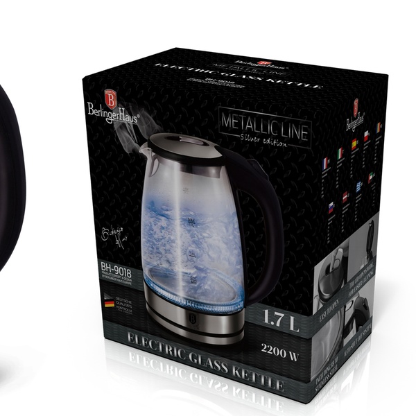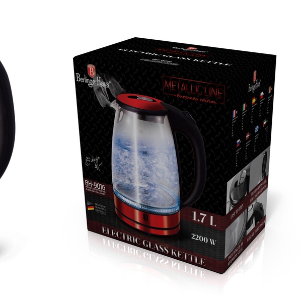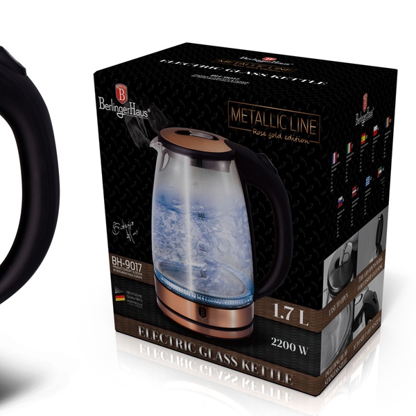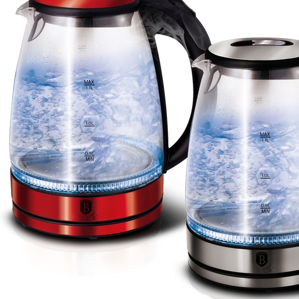 Moderner Glas-Wasserkocher mit blauer LED-Innenbeleuchtung und 1,7-Liter-Füllmenge sowie einem schnellen Kochprozess durch 2.200 Watt