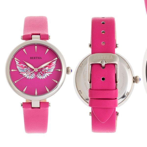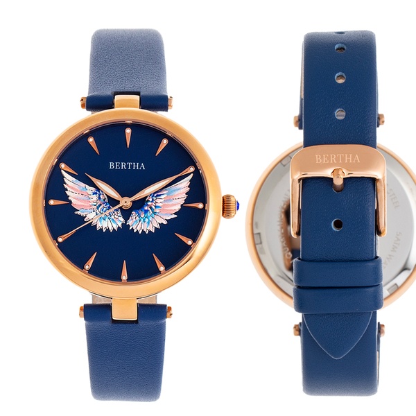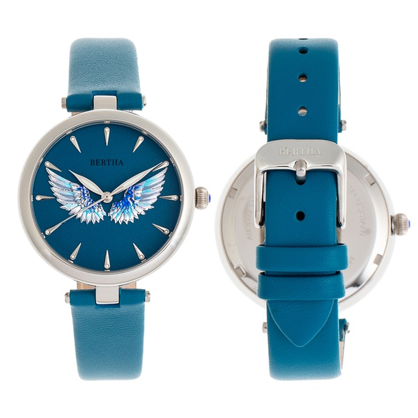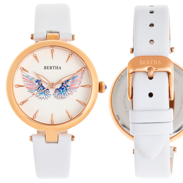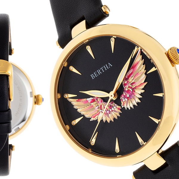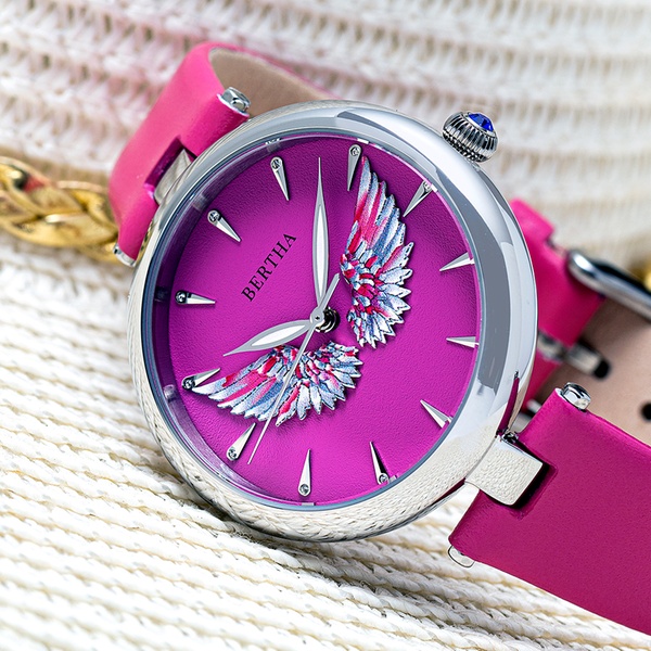 Elegante Damen-Armbanduhr mit 3D-Engelsflügel auf dem Zifferblatt, Krone mit Juwelen sowie Gehäuseboden mit Logo-Gravur