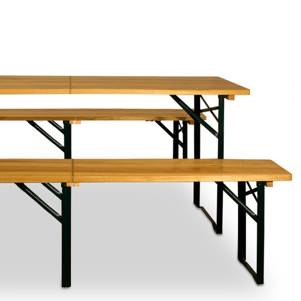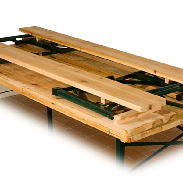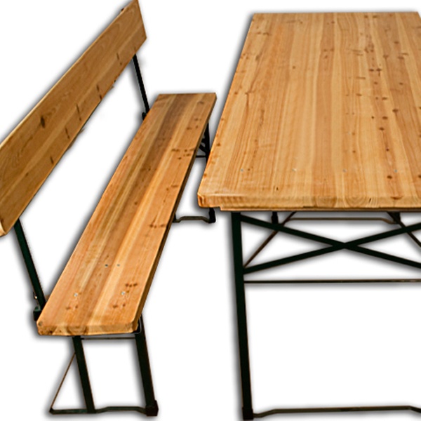 Klappbare, leicht zu verstauende Bierzeltgarnituren aus Tisch und 2 Bänken aus Holz oder Kunststoff, optional mit Rückenlehnen