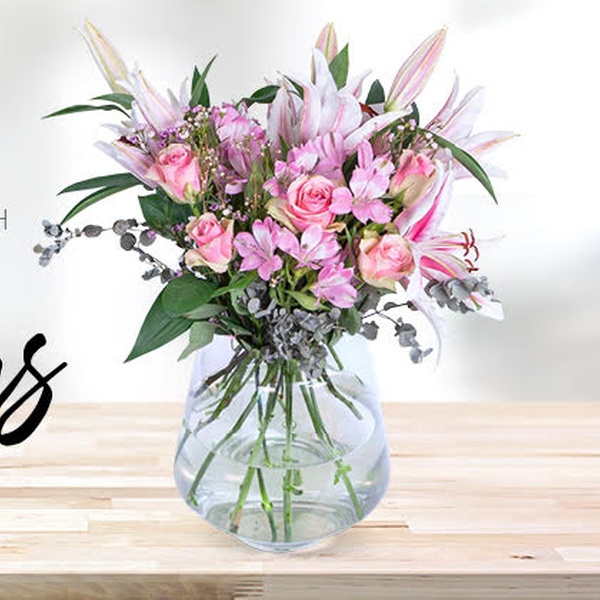 - Bouquet „Venus“ mit Rosen, Lilien, Alstroemeria, Eukalyptus