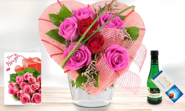 Ist man frisch verliebt, sprechen Rosen ihre eigene, zauberhafte Sprache. Die Königin der Blumen ist wohl eines der beliebtesten und schönsten Zeichen der Liebe. Und damit die Schmetterlinge im Bauch und das Herzklopfen noch lange währen, bietet das Blumenhaus Ehrend hochwertige Blumen-Arrangements, die dem Lieblingsmenschen zeigen, wie gern man ihn hat. Mit diesem Bluvesa Gutschein wählen Groupon-Kunden aus verschiedenen Rosen-Arrangements ihre Lieblingsvariante. Zartschmelzende Lindt Schokolade, prickelnder Perlwein sowie eine individuelle Grußkarte komplettieren den persönlichen Blumengruß. Von der haltbaren Rose über Rosensträuße mit bis zu 30 Rosen in Rot und Bunt bis hin zu liebevoll arrangierten zweifarbigen Rosen-Arrangements gibt es eine breite Auswahl, die Herzen höher schlagen lässt.