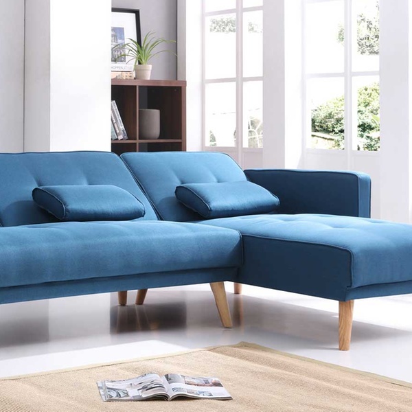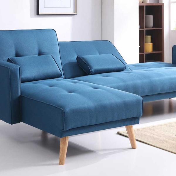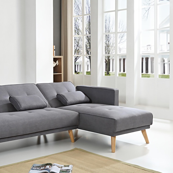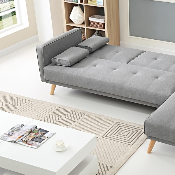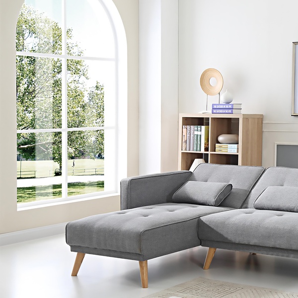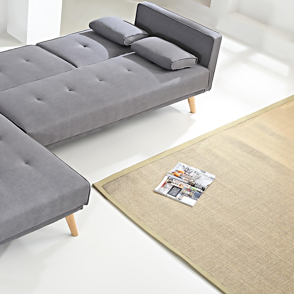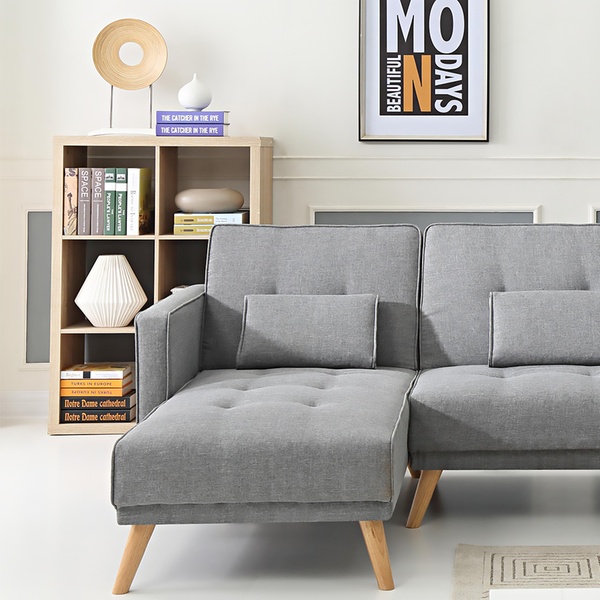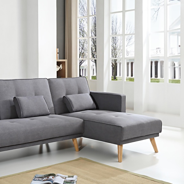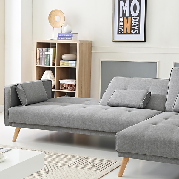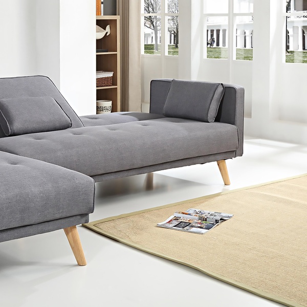 Dieses stilvolle Ecksofa aus hochwertigem Holz sorgt für einen hohen Sitzkomfort und lässt sich als Bett oder Chaiselongue benutzen