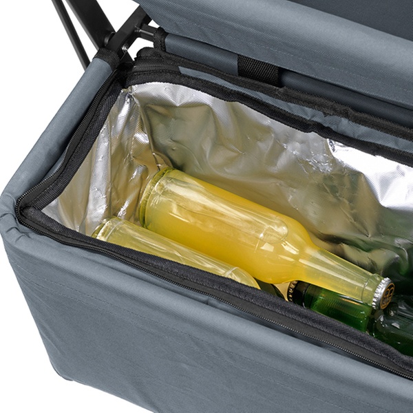- Mit Getränkehalter, Kühltasche, drehbaren Rädern und Bremsen