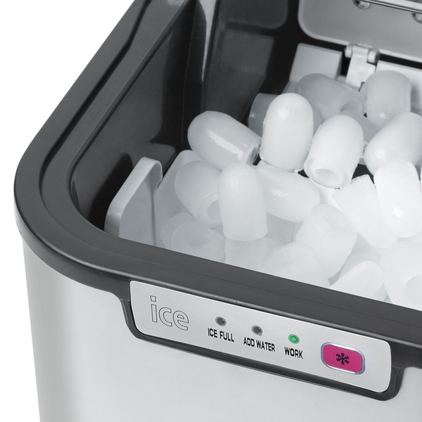 - LED-Kontrollleuchten und akustisches Signal, wenn der Eiswürfelbehälter voll oder der Wassertank leer ist