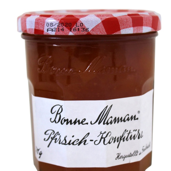 Inhaltsstoffe: Pfirsiche, Zucker, brauner Rohrzucker, Zitronensaftkonzentrat, Geliermittel: Pektin (Citrus)