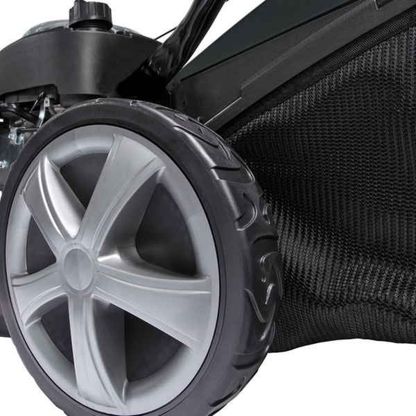 Leistungsstarker Rasenmäher mit 4-Takt-Benzin-Motor und zuschaltbarem Selbstantrieb sowie robustem Grasfangsack mit Füllstandsanzeige