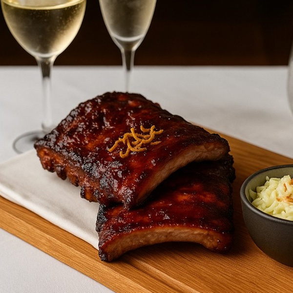 - 2. Gang: Spareribs (BBQ Sauce | Kräuter-Kartoffelecken | Cole Slaw | Röstzwiebeln)