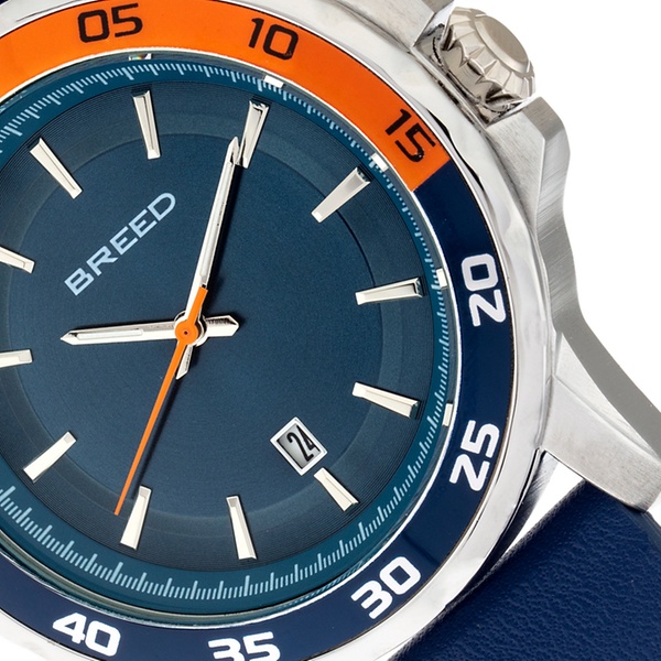 - BRD8306: Gehäuse: Silber / Armband: Braun / Zifferblatt: Schwarz / Lünette: Blau-Orange