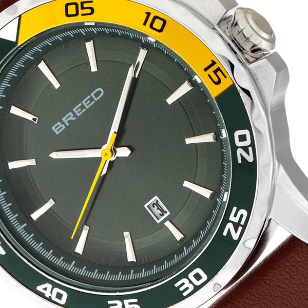 - BRD8305: Gehäuse: Silber / Armband: Braun / Zifferblatt: Dunkelgrün / Lünette: Schwarz-Gelb