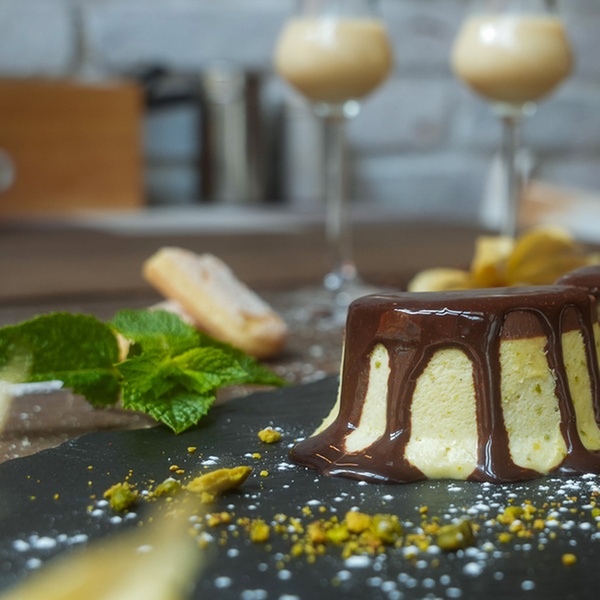 • Semifreddo alle Mandorle: hausgemachtes Mandel Parfait mit Karamell & Zwetschgenragout