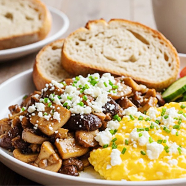 • Sunrise Mushrooms: Rühreistrudel mit gebratenen Champignons, VFeta und Brot