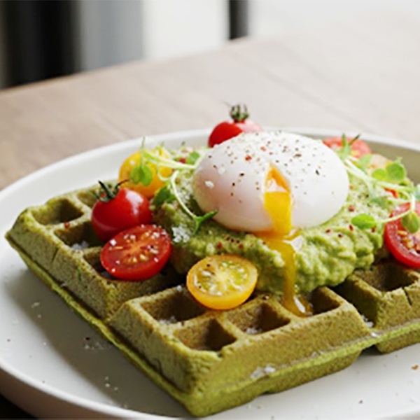 • Power Waffel: Herzhafte, glutenfreie Spinat-Zucchini Waffel mit einem pochierten Ei, Avocado creme und VFeta