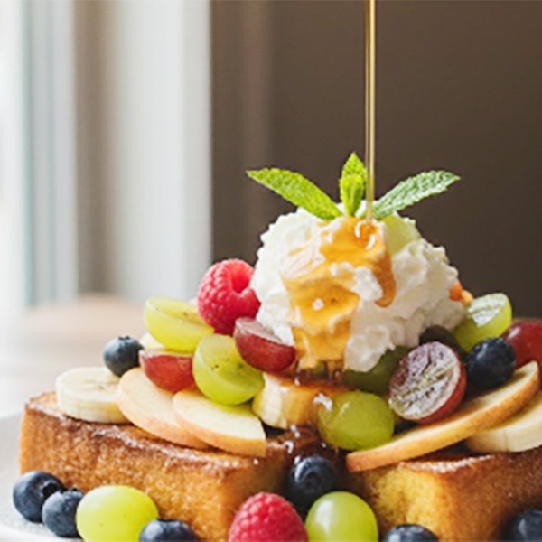 • French Toast: Zimtiger Brioche-French-Toast mit frischen Früchten, Nussmischung, Creme und Ahornsirup
