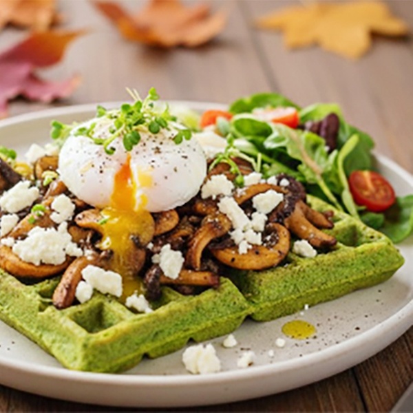 • Trüffel Zauberwaffel: Glutenfreie Spinat-Zucchini Waffel mit gebratenen Champignons, VFeta, 1 pochiertes Ei und Trüffelöl