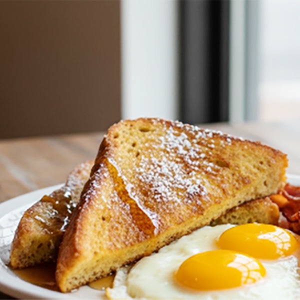 • Hangover Toast: Zimtiger Brioche-French-Toast mit 2 Spiegeleier, Bacon und Ahornsirup