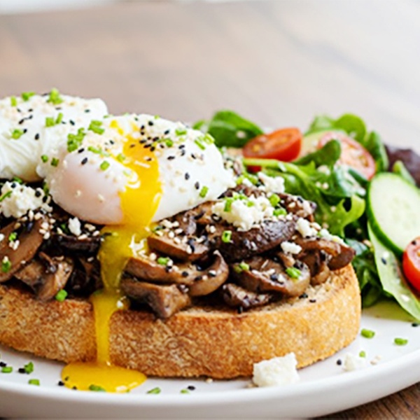 • Eier Funghi: 2 pochierte Eier auf Brot mit gebratenen Champignons, Trüffelöl und VFeta