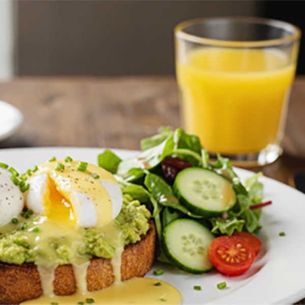 • Eggs Avocado: Zwei pochierte Eier auf einer dicken Scheibe geröstetem Sauerteigbrot mit Avocadocreme und Tomaten mit klassischer Sauce Hollondaise und einer frischen Salatgarnitur
