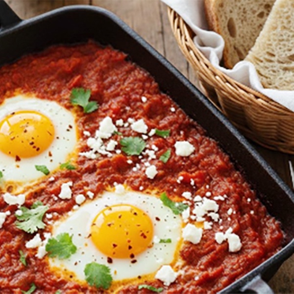 • Shakshuka: 2 Eier in würziger Tomaten-Paprika Sauce mit VFeta, pulled Chicken, direkt in der Pfanne serviert. Dazu Brot