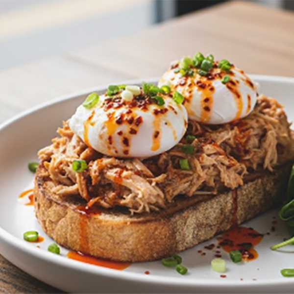 • Eggs Rodeo: 2 Pochierte Eier auf Brot mit tomato pulled Chicken, Sesam und Chili Öl
