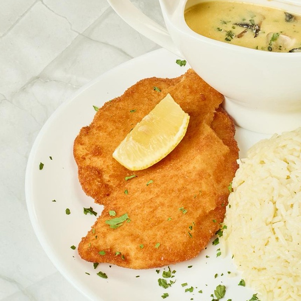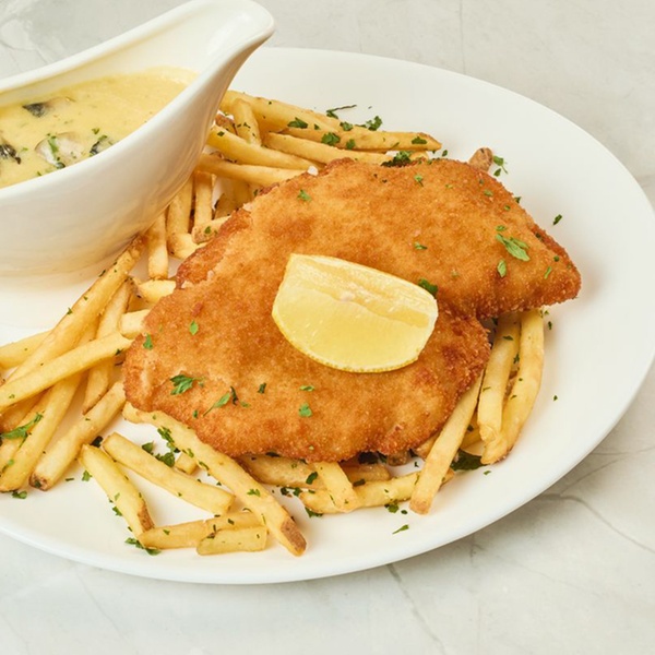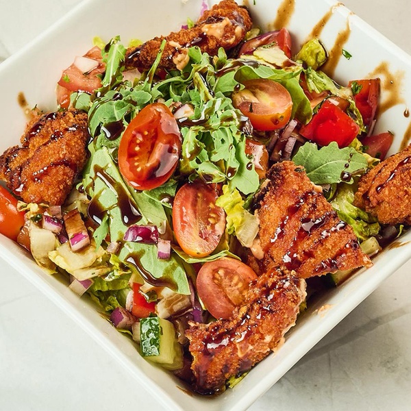 • Crispy Chicken Burger: Brioche Bun, Römersalat, Tomate, rote Zwiebeln, House Sauce