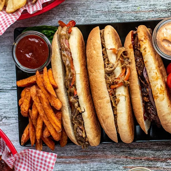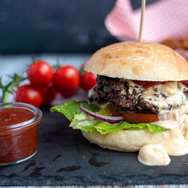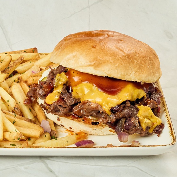 Genieße saftige Burger wie Cheese, Chilli-Cheese, BBQ, Crispy Chicken oder Halloumi mit knusprigen Pommes und erfrischendem Softdrink