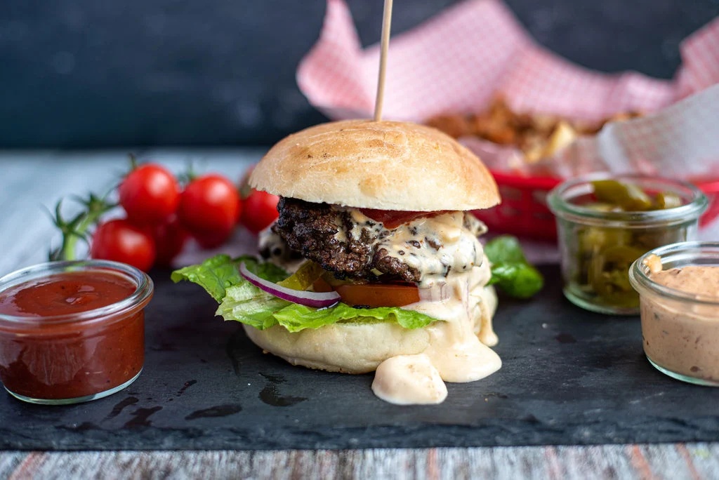 • Chilli-Cheese-Burger: Brioche Bun, Römersalat, Tomate, rote Zwiebeln, Scottisch-Mild-Cheddar,House Sauce, Jalapenos
