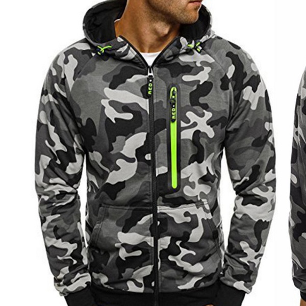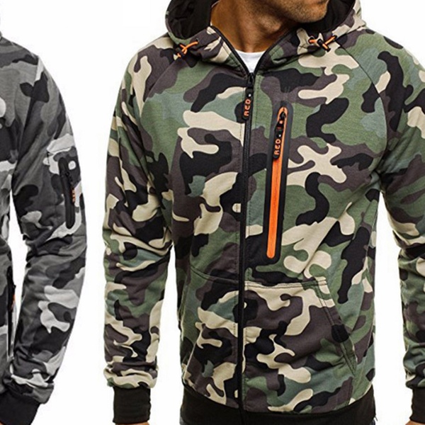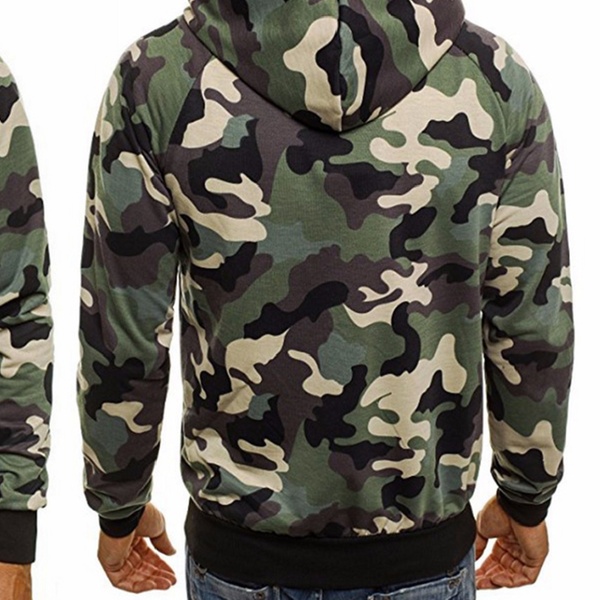 Dieser Langarm-Hoodie mit Kordelzug-Kapuze, Reißverschluss und zwei praktischen Fronttaschen ist im angesagten Camouflage-Muster gehalten