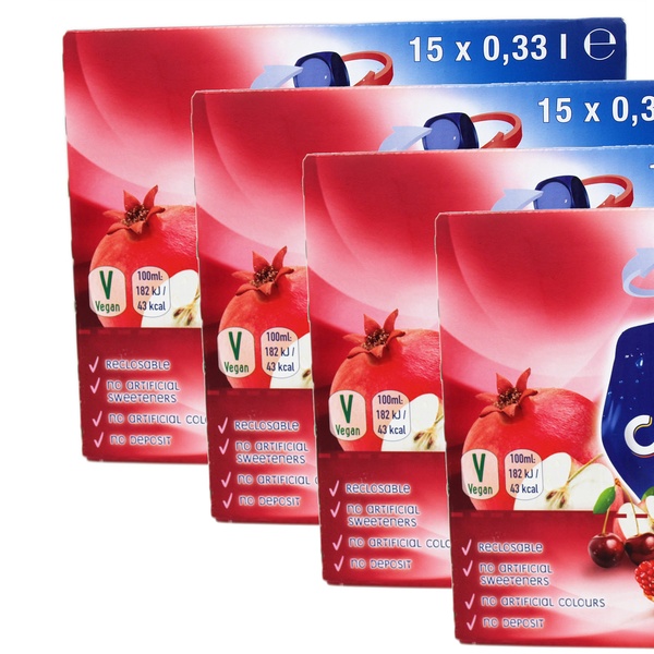 - Zutaten: Quellwasser, Zucker, Sauerkirschsaft (4,5%), Apfelsaft* (4,4%), Granatapfelsaft* (1%), Säuerungsmittel Citronensäure, Aroniasaft, natürliches Aroma, Vitamin C. (aus Fruchtsaftkonzentrat)*