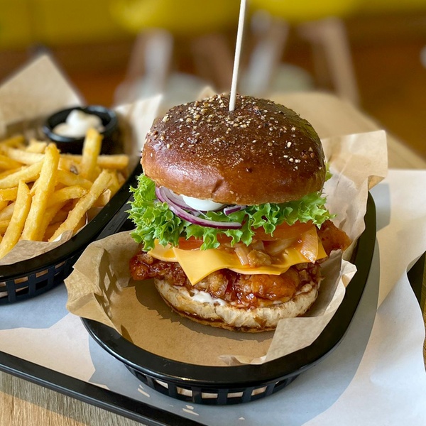 • Chicken Spicy Burger: Brioche Bun mit knusprig paniertem Hähnchenbrustfilet, feuriger Gochujang-Sauce, Tomate, Käse, Zwiebeln, würzigem Kimchi und frischem Salat