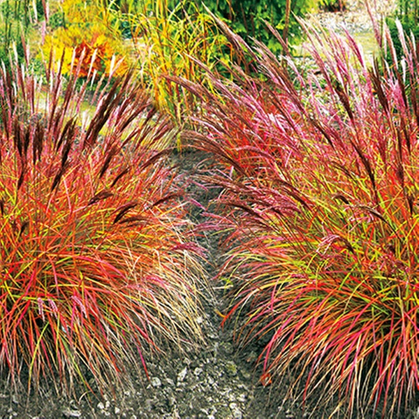 Von August bis Oktober werden rot-orange Blüten-Wedel das schöne und halbkugelig wachsende Chinaschilf „Red Chief“ im Garten schmücken