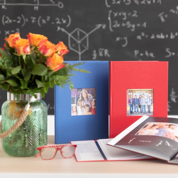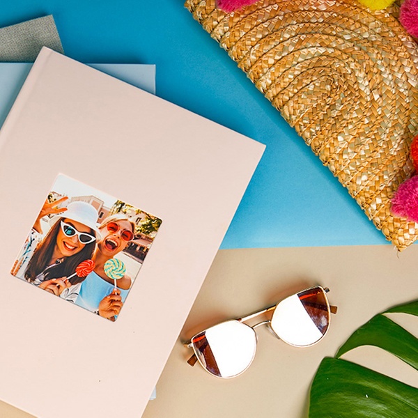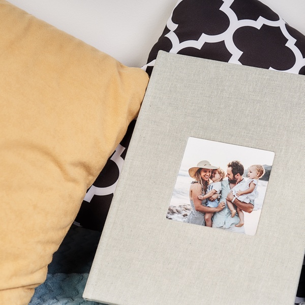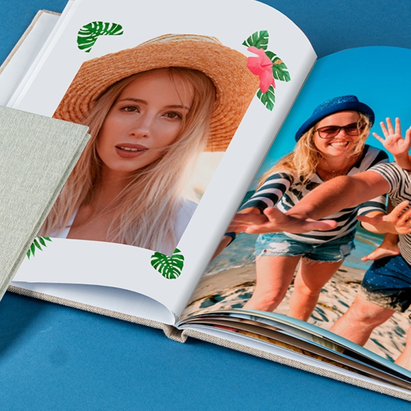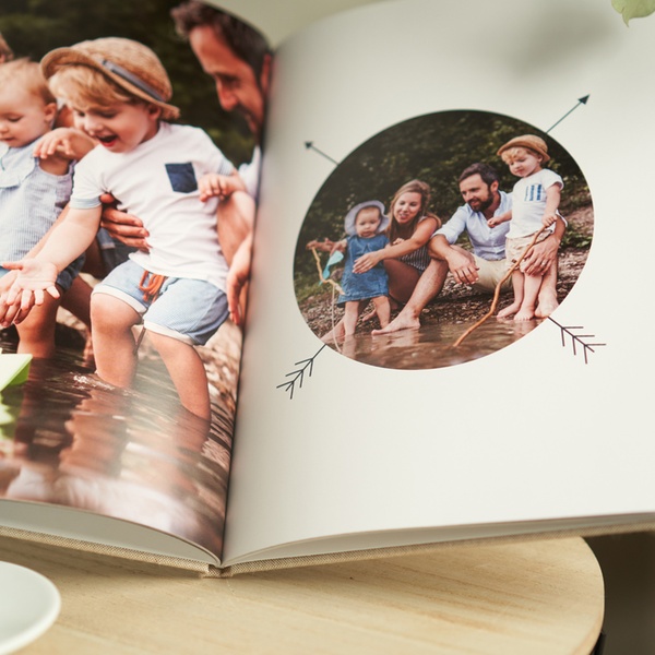 Fotobuch im A4-Hoch- oder Querformat mit Cover aus Öko-Leder oder Textilgewebe sowie Bildern und Texten auf elegantem steifem Kreidepapier